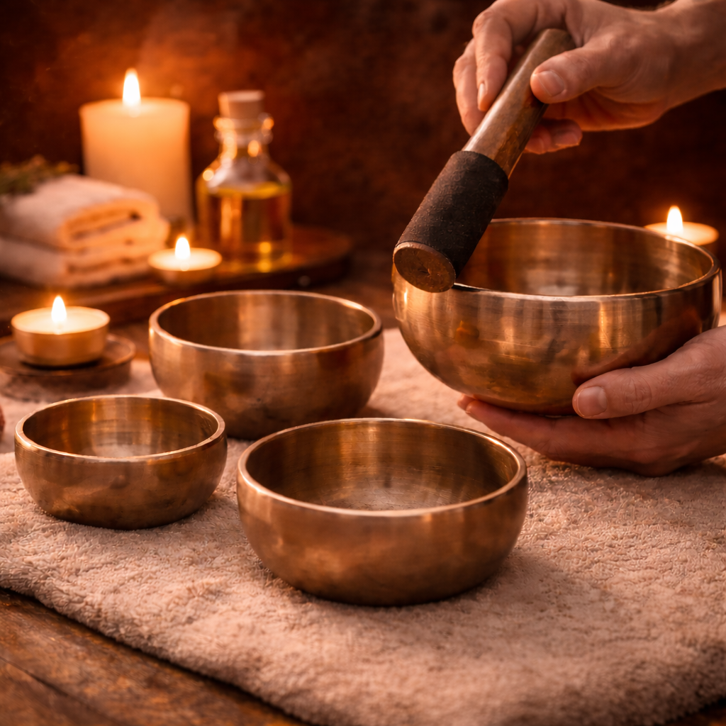 Die Schwingungen der Klangschalen breiten sich im Körper aus und können helfen, Stress abzubauen, den Geist zu beruhigen und tiefe Entspannung zu fördern.