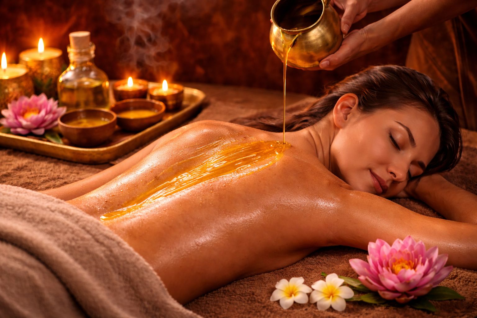 Traditionell wird die Massage mit warmem Sesamöl durchgeführt, das im Ayurveda für seine wärmenden, nährenden und entgiftungsunterstützenden Eigenschaften geschätzt wird. Das Öl pflegt die Haut intensiv, fördert die Durchblutung und unterstützt den Körper bei Entgiftungs- und Ausleitungsprozessen.